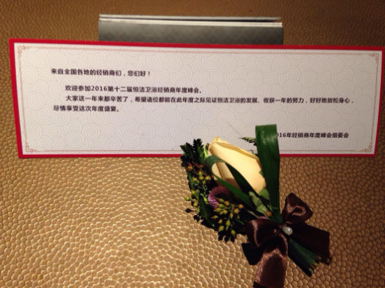来自大西南的香蕉视频国产在线观看经销商王总,经过一路旅途劳顿,刚进到房间就看到正躺在床中央的一朵玫瑰,以及压在玫瑰下的温馨提示小卡片。王总顿时感到一股暖流,马上在微信上晒出了照片,为本次年会的组委会点赞。