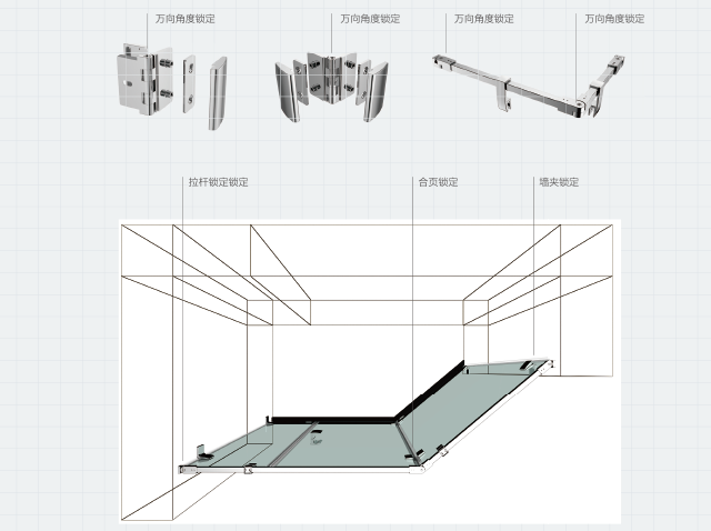 门铰内部结构设计安全开启限位,避免玻璃间的直接碰撞。