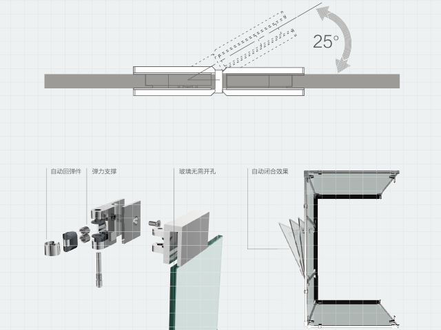 自动闭合门设计25°角自动闭合玻璃门技术,解决了门铰无法自动闭合所产生的安全银黄。